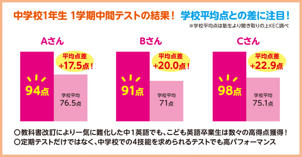 それでも、KECこども英語教室の卒業生は、学校平均点を大きく上回る高得点を多数獲得しています。
