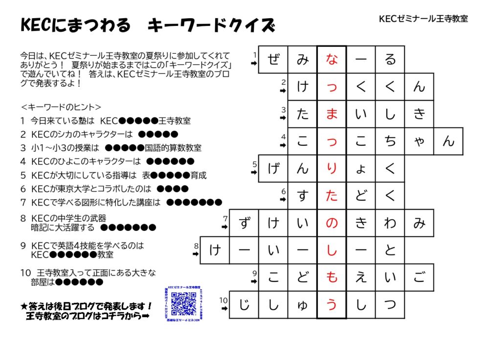 夏祭りの中で配布した、キーワードクイズとなぞときの答えを発表します!