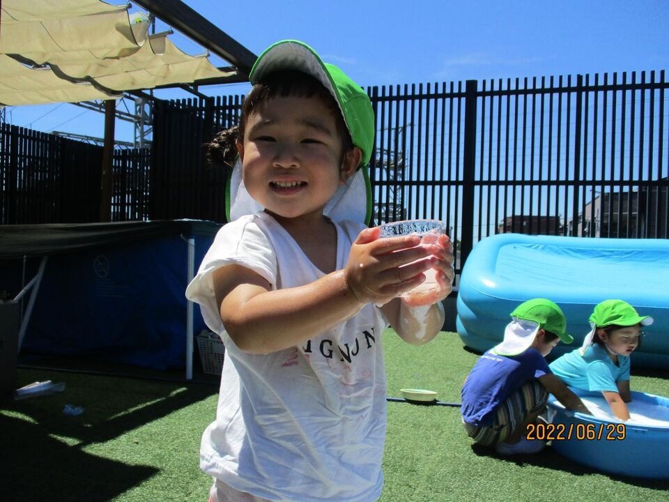 泡を触って感触を楽しんだり手に塗って「きもちいい!」と感触を楽しんだりしました。