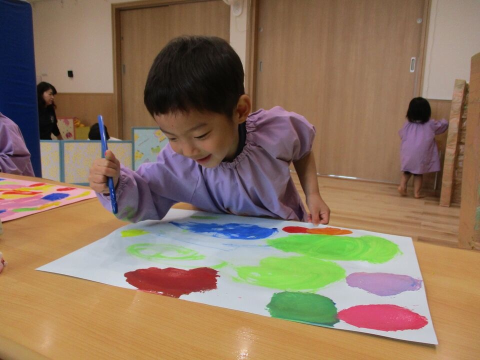 子どもたちは、筆で描く感触・塗りながらできる形・色が混ざったときの色の変化が楽しかったようで