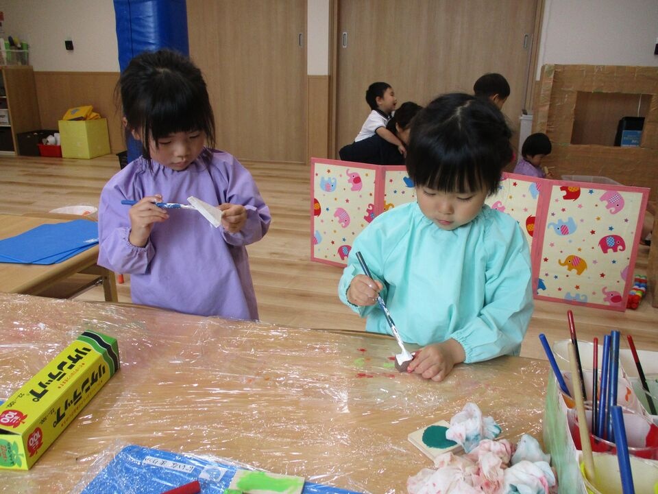 今日は様々な形の木材に好きな色を塗ったりお絵描きをしたりしてお弁当に入れる具材を作りました。