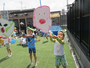 手作り水鉄砲やスポンジ水鉄砲、水遊びの玩具で遊ぶことを楽しんでいました。