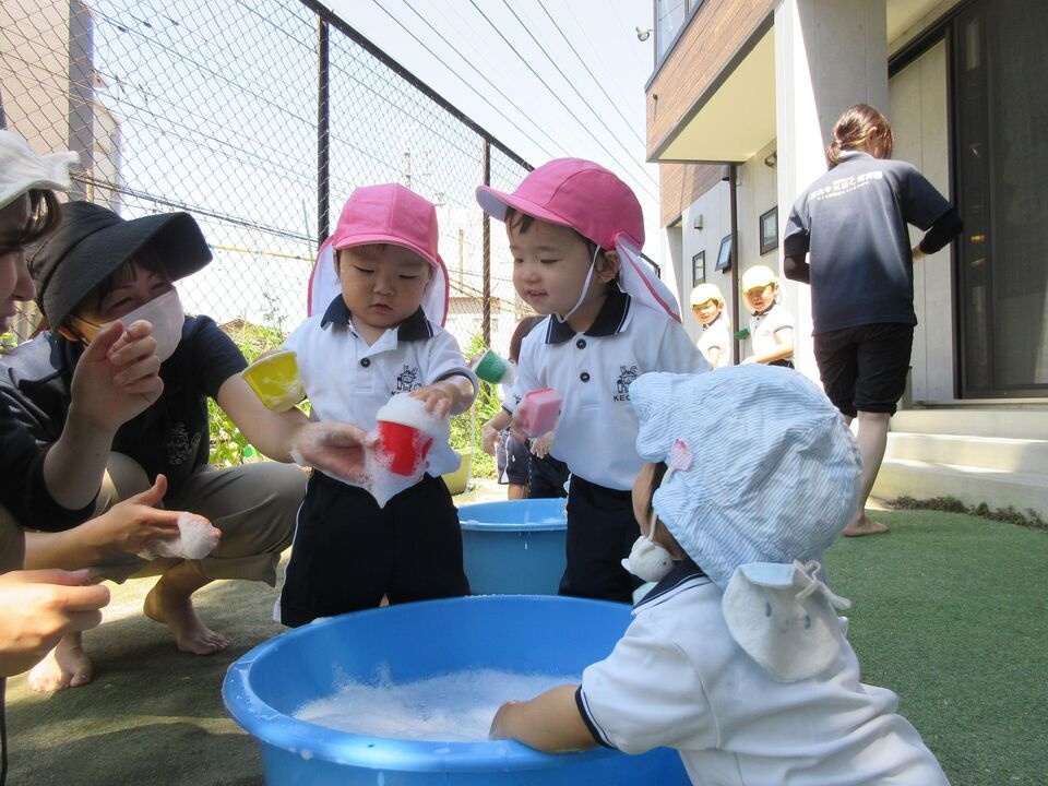 園庭に出てたらいの水にハンドソープをちょろっと入れた後ぐるぐる混ぜてみました(^^)