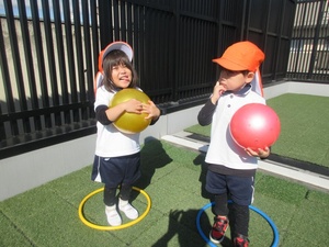 最後はボールやフープ、ジャンプボールを出し好きな運動用具で自由に遊びました。