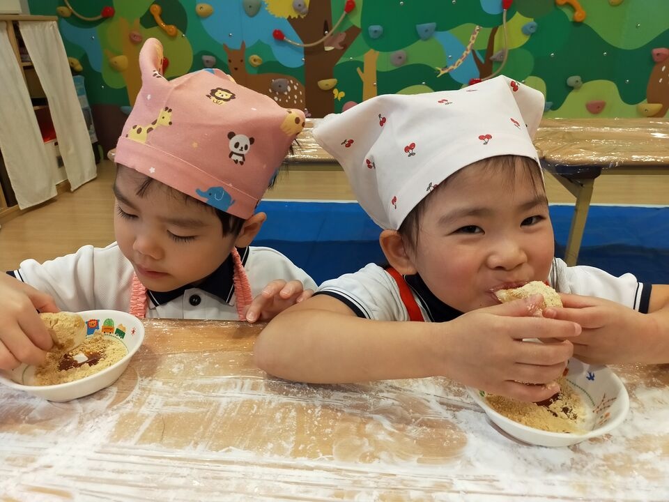 幼児クラスは出来上がったおもちを丸めて、きなこや砂糖醤油をかけて食べました。