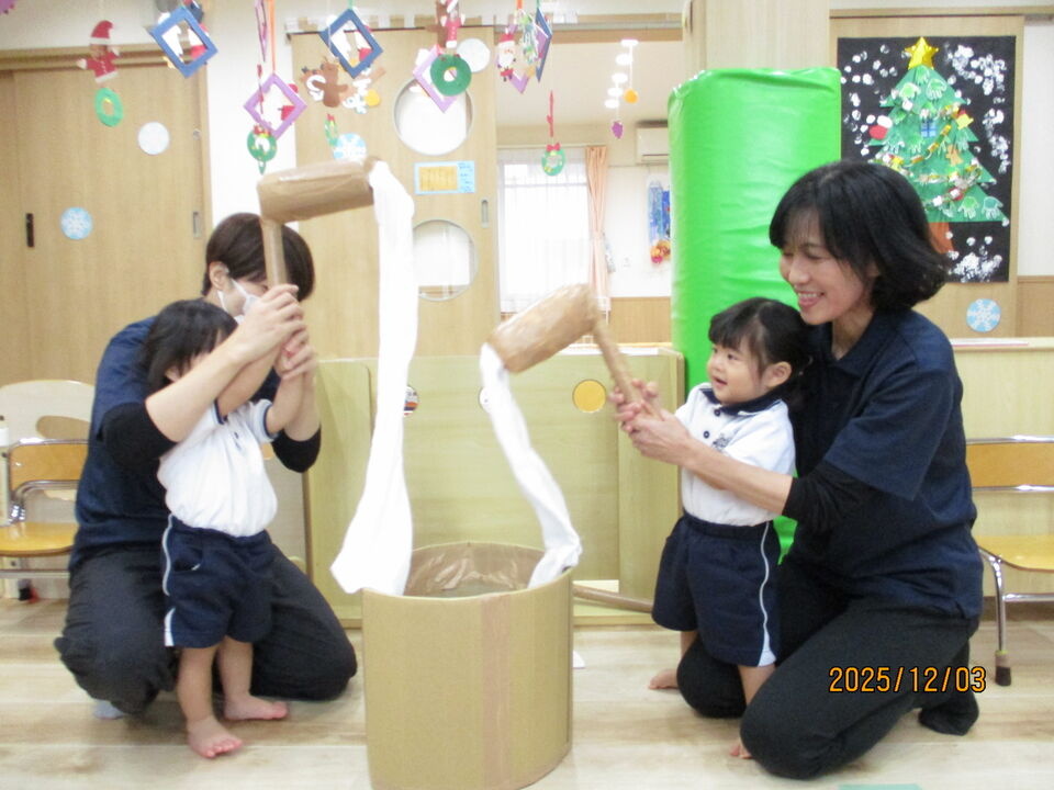 おもちつきクイズでは、「お正月の前に作るんだ!」「鏡餅っていうんだね」と、