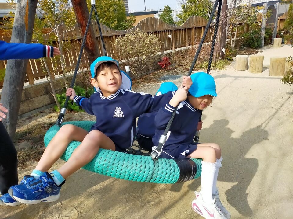 屋外では、乗ると音が鳴る遊具や大きな滑り台、吊り橋のある総合遊具に挑戦し、