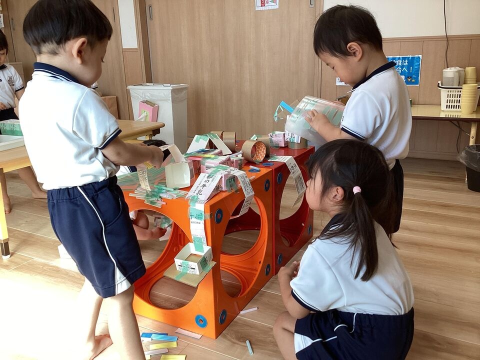 お友達や保育者にと「これはジュースの作る機械ね」「一緒にブルドーザーつくろっか」「これは滑り台にしよう」と