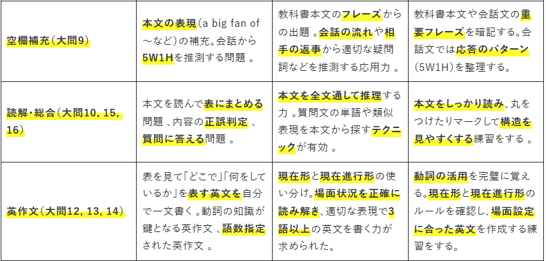 表の情報を基にした描写や、場面指定のある英作文が多く出題されています。(例:「あなたの家族、または友達が毎日していることを教えてください」に対して、3語以上で英作文を答えなさい。)これらの問題に対応するため、現在形と現在進行形を使い分け、3語以上で自分の考えを正確に表現する練習を習慣にしましょう!そして、何度も書いて、やり直しをしましょう!