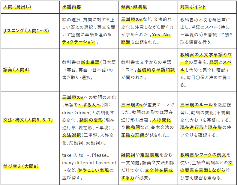 今回のテストは、三単現のsや人称代名詞など、1年生で習う基礎文法の正確な定着と、それを自力で表現する力が問われる構成でした。