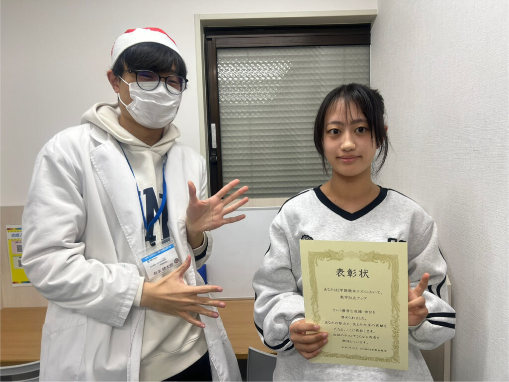 こちら一条中学校に通う中学3年生の生徒さんで2学期期末試験の数学で89点獲得しました!