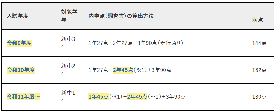 これまでお伝えしてきた「配点の多様化」に加え、今後は内申点(調査書)の計算方法そのものが段階的に変更されます。