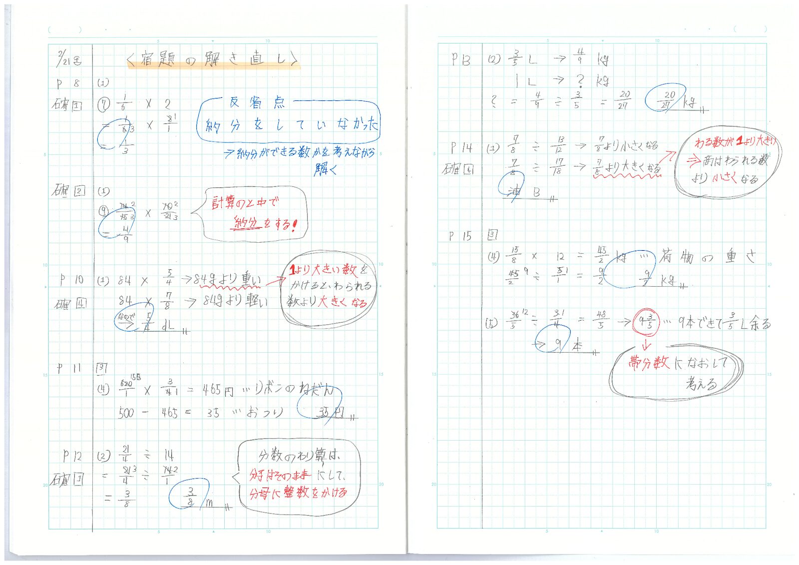 「算数」の解き直しをしているノートを