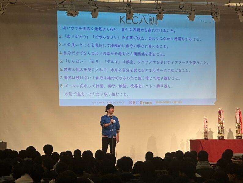 分離礼から始まり、KEC八訓の唱和・この冬期合宿に参加するにあたってのお話を、教室長の北山から会場に向かって発信しました。