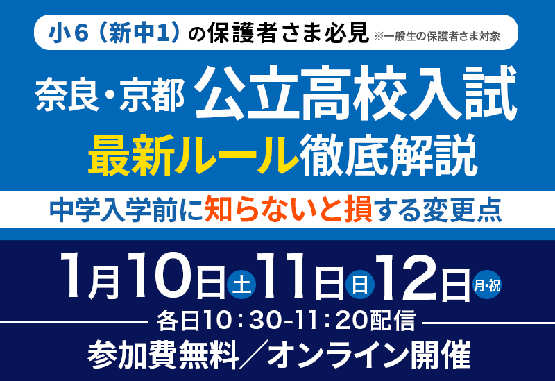 【無料】小6(新中1)保護者さま向け特別オンラインセミナー|奈良・京都公立高校入試 最新ルール徹底解説ー中学入学前に知らないと損する変更点