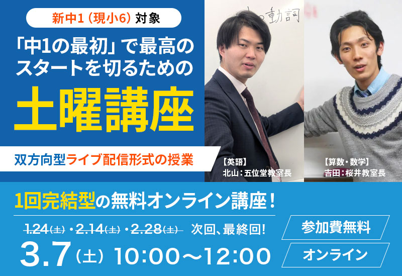 【新中1(現小6)対象】土曜講座(無料・オンライン)お申し込み受付中!