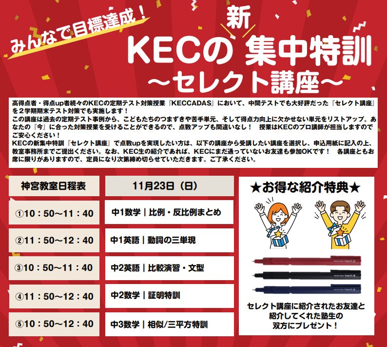 11月23日(日)には、集中特訓に加えて期末テスト対策の「セレクトゼミ」を開催します!