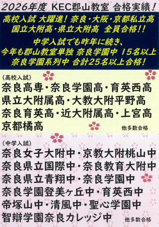 高校入試合格速報! 奈良・大阪・京都私立、国立大附属、県立大附属の合格率100%!