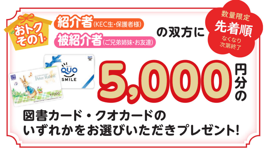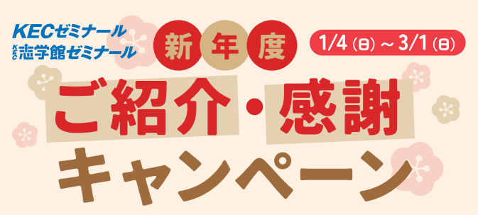 KEC生・保護者さまから紹介を受けてKECゼミナール・KEC志学館ゼミナールにご入塾手続きをされた方、ならびに紹介してくださった方の双方に大変お得なキャンペーンを実施いたします!!