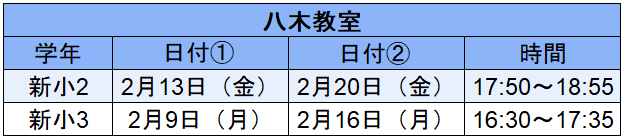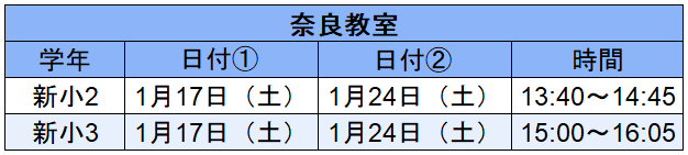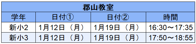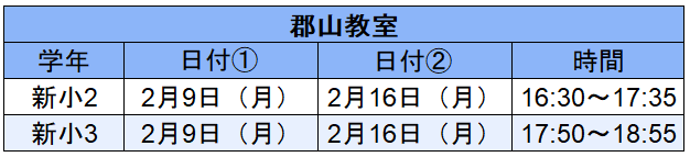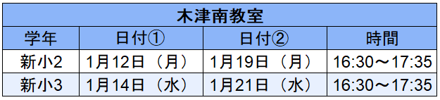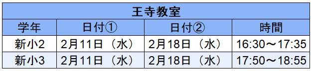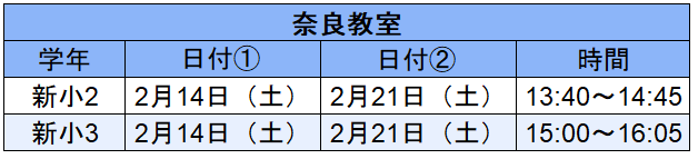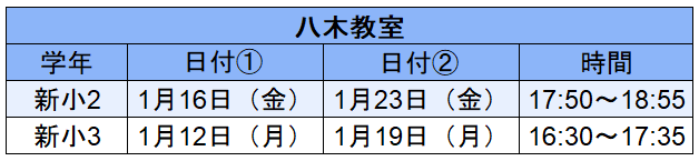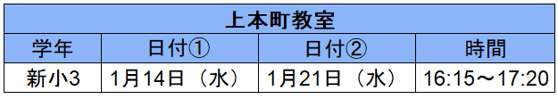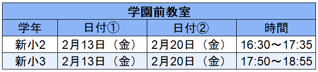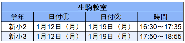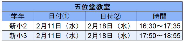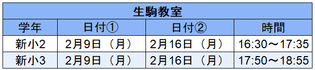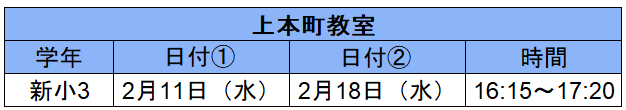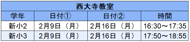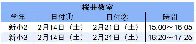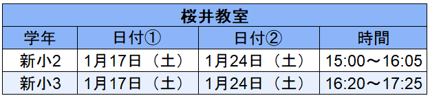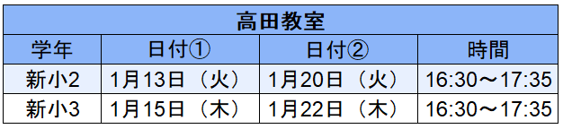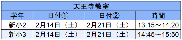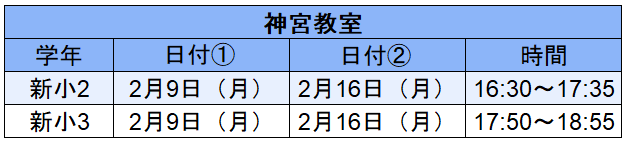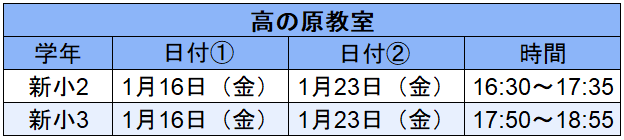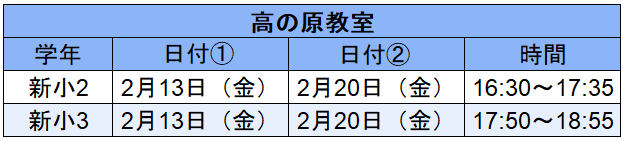 | 期間 | 〈第1弾〉2026年1月12日(月・祝)~1月24日(土) 〈第2弾〉2026年2月9日(月)~2月21日(土) ※教室によって開講日程が異なります。 ※各教室複数クラスがあるため、詳細日程は教室にお問い合わせください。 |