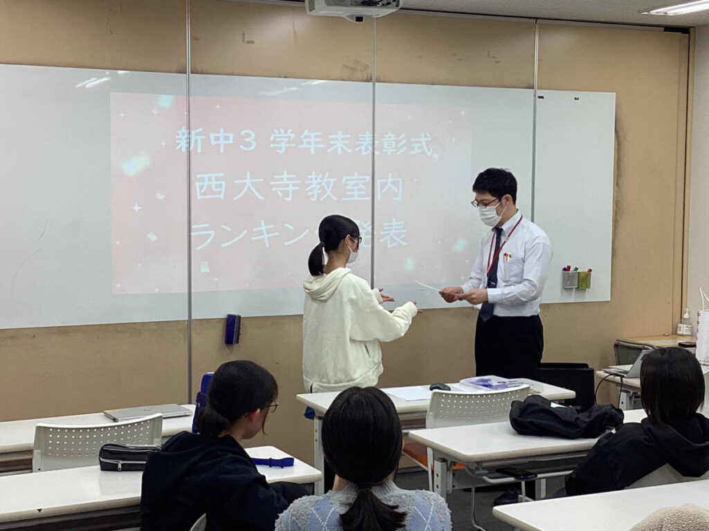 先日、新学年に向けたオリエンテーションと共に、新中2生・新中3生と1年のラストを締めくくる「定期テスト表彰式」を実施しました!