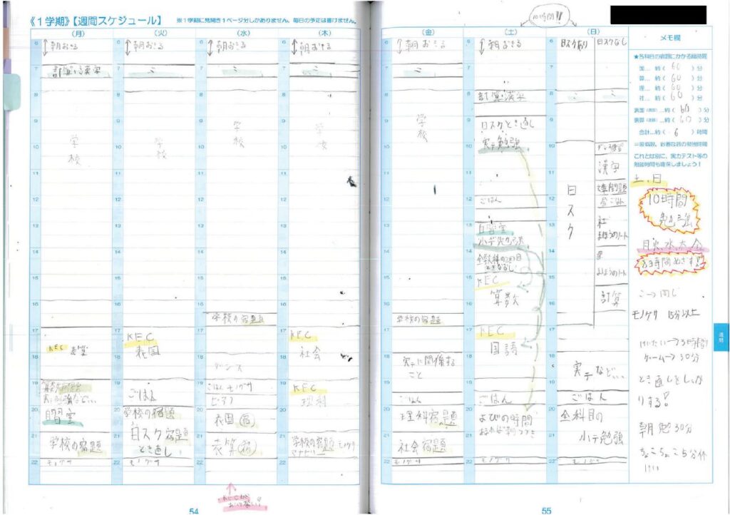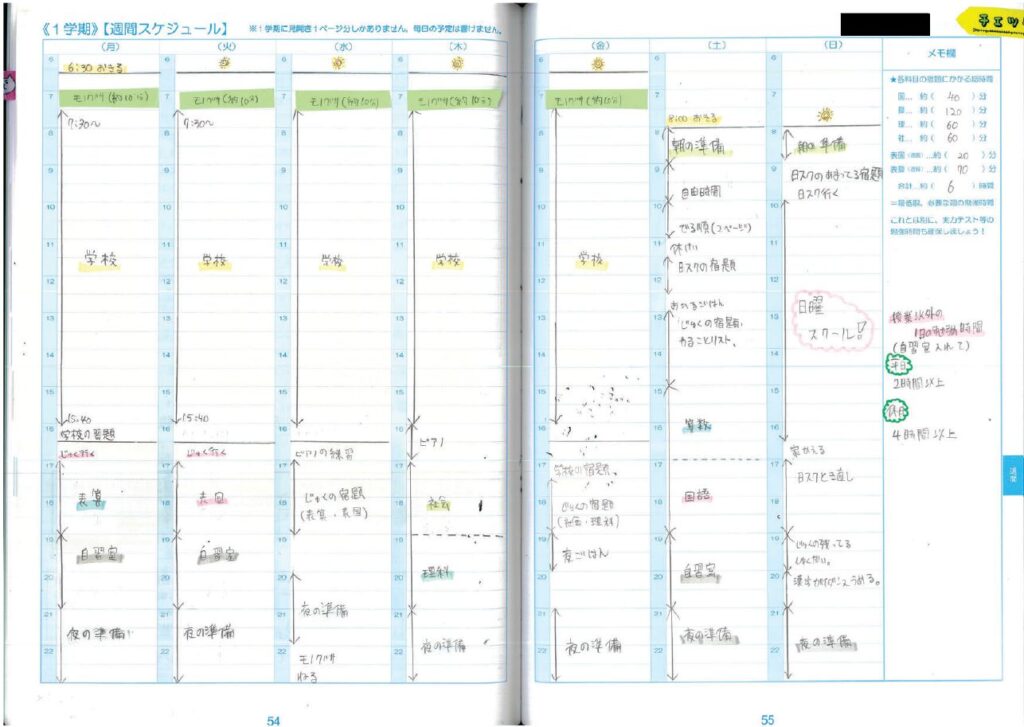 - 分単位のスケジュール: 帰宅後の習い事や塾へ行くまでの短い時間にも、やるべき宿題をパズルのようにはめ込んでいます 。