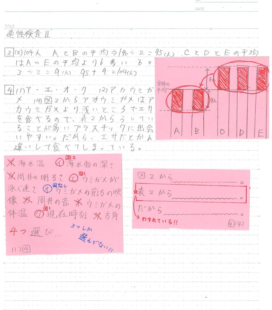 テストに対しての解き直しなどに注力してくださっている塾生が非常に増えてきており、上記のような日ごろの授業での解説を付箋にメモで残し、解き直しノートに活用する方も増えてきております。中学生顔負けの効率・効果の高い授業の受け方に解き直しのやり方と、素晴らしい限りです!