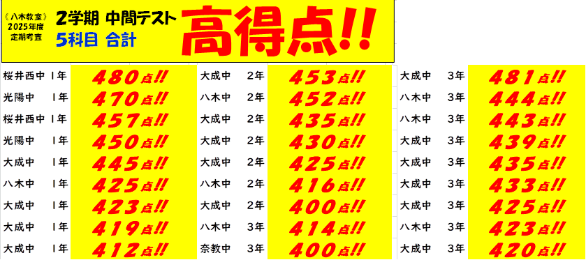 今回のテストで、なんと59点UP。445点を獲得!素晴らしい!! - 中2 大成中学校 Mくん