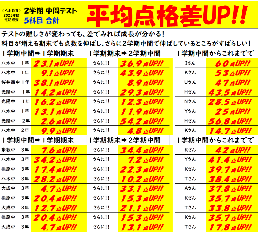 5科目合計、64点UP!!部活もされていますが、宿題はわすれることなくやってきてくれます。