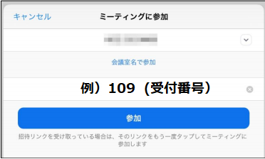 ②「ミーティングID」と名前の部分に「受付番号」を入力して参加をタップします。